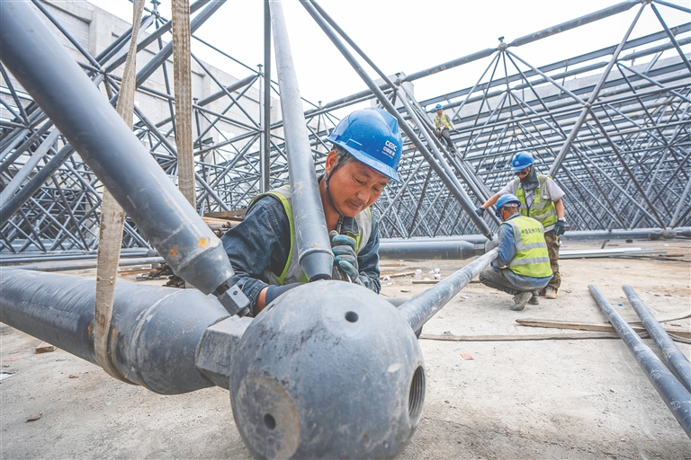 3月12日,在位于文昌国际航天城航天总装发射区的海南卫星超级工厂项目建设现场,工人加紧进行钢结构等施工作业。