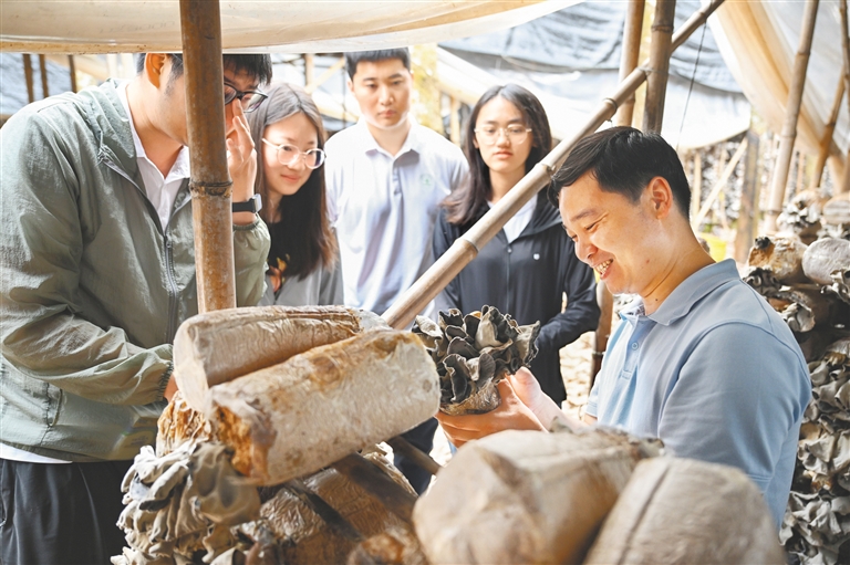 近日,海南儋州食用菌科技小院负责人罗灿(右一)在指导学生。