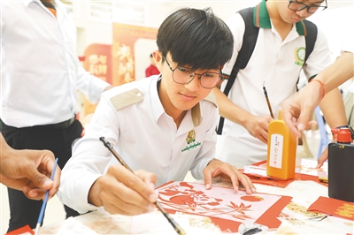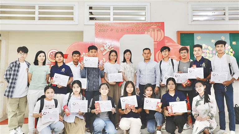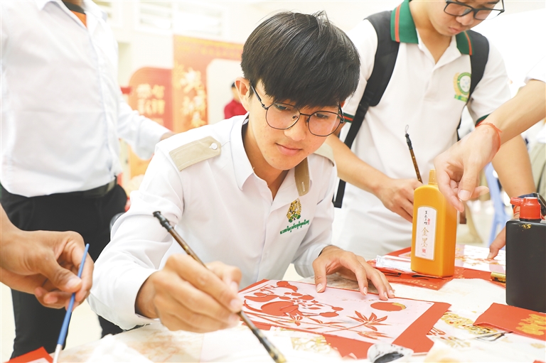 教室里,海南大学柬埔寨王家农业大学孔子学院初级班的学生们写春联、书福字、做灯笼,感受中国春节文化魅力;