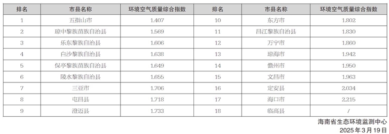 环境空气质量排名靠前的市县分别是五指山市、琼中黎族苗族自治县和乐东黎族自治县,排名靠后的市县分别是海口市、定安县和文昌市。受台风“摩羯”影响临高县站房损坏,2024年各项污染物有效天不足,不参与排名统计,全省17个市县环境空气质量排名如右:
