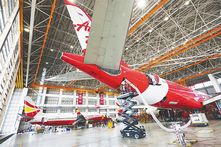 日前,在海南自贸港一站式飞机维修产业基地,工作人员检修进境飞机。据介绍,该基地自2022年2月投产以来,共完成逾1980架飞机、约4.7万多个航空零部件的维修工作及220架飞机喷涂工作。图/文 海南日报全媒体记者 陈元才 通讯员 余楚烨