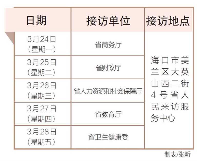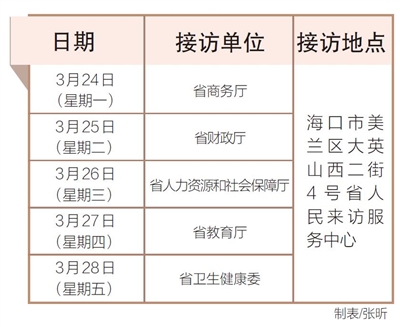 3月24日至28日,省商务厅、省财政厅、省人力资源和社会保障厅、省教育厅、省卫生健康委相关负责人将在海口市美兰区大英山西二街4号省人民来访服务中心接访群众。