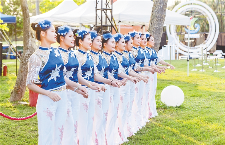 “先方儿嘱姑不去,等到好哥嘱慢来……”3月24日下午,博鳌东屿岛文化公园,海南自贸港建设成果展暨儋州城市展门口,身着蓝白色传统服饰的儋州调声队正踢着欢快的舞步,吟唱曲目《嘱姑九点半》。