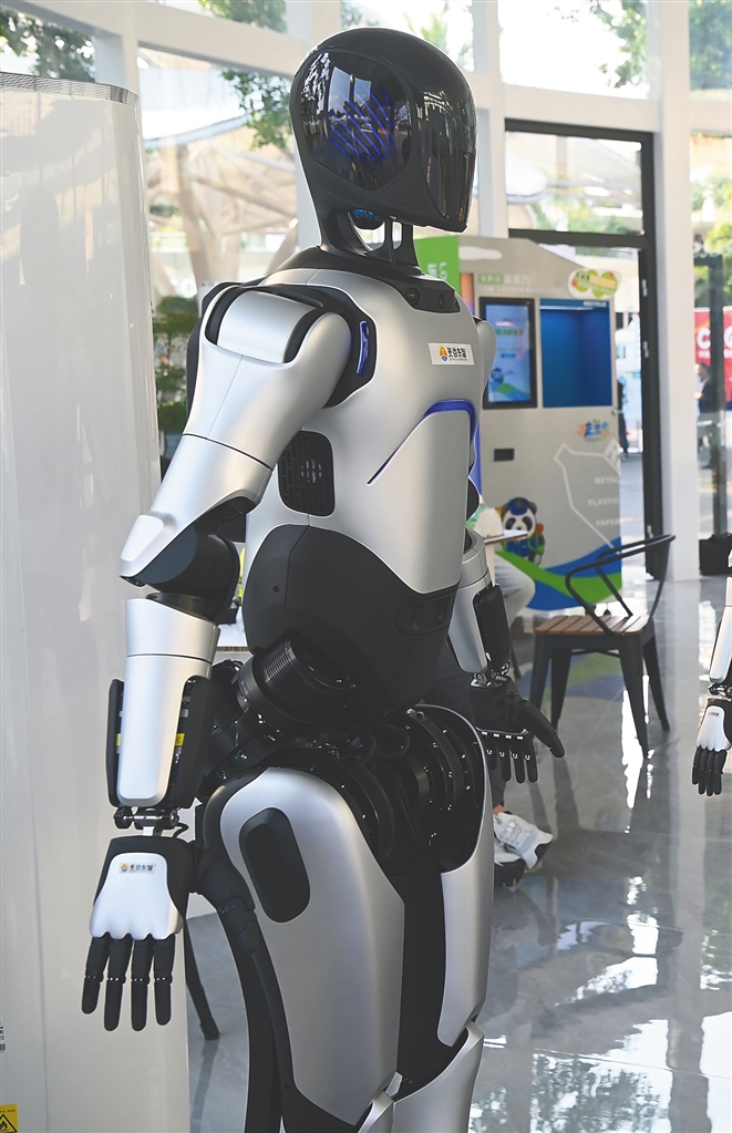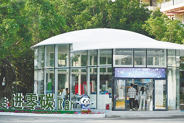在体验东屿岛生态景观,践行低碳生活的同时,市民游客还可以来到零碳Bar,体验科技创新融合绿色低碳,通过线上碳普惠融合线下绿色低碳服务体验区,让节能降耗减碳的生活行为和工作方式融入生活。大家可以在这里体验动能发电,感受自己的动能转换;体验PET塑料再生工坊,感受塑料瓶可回收的一生;还有人形机器人的互动和表演,欢迎大家前来探索,并为积极参加碳普惠活动的游客准备了海南非遗椰雕、东屿岛椰麻袋等文创商品兑换。