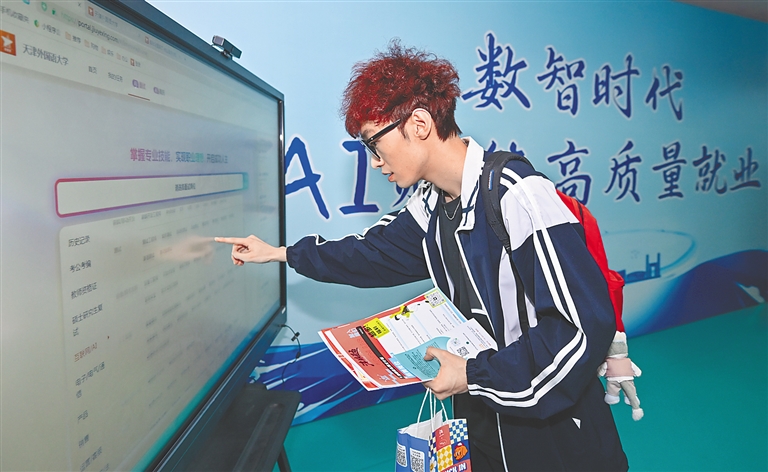 3月25日,在天津外国语大学,应届毕业生使用人工智能就业服务平台检索招聘岗位。