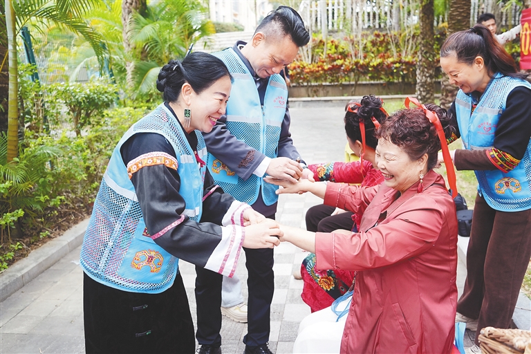“阿婆,肩膀酸不酸?我给您按按……”近日,在琼中营根镇半山和园小区,乐善义工社社长王海燕带领志愿者为老人们按摩肩颈,现场歌舞声与欢笑声交织成温暖乐章。这支身着蓝马甲的队伍8年来穿梭在黎村苗寨,累计服务超4万人次,用行动诠释“爱心、奉献、协作、快乐”的公益理念。