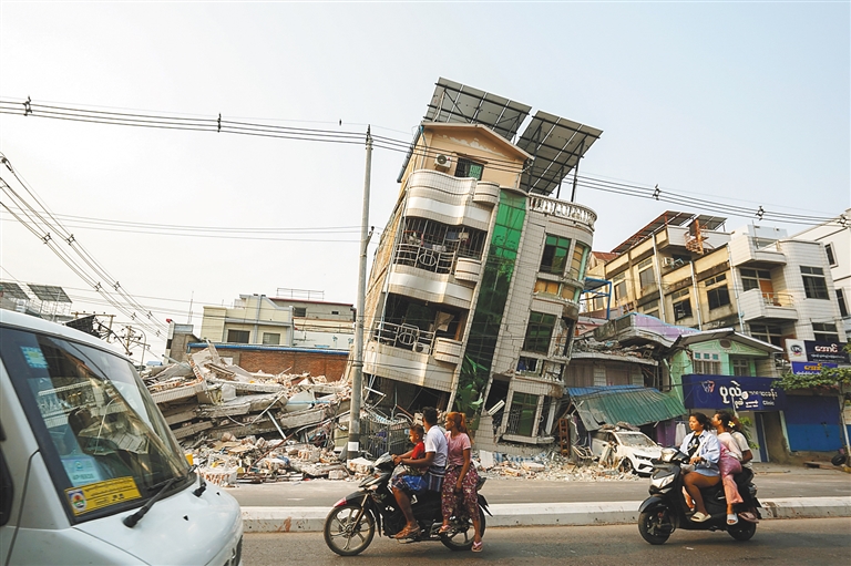 3月30日,在缅甸曼德勒,人们骑行经过地震后受损的建筑。新华社发