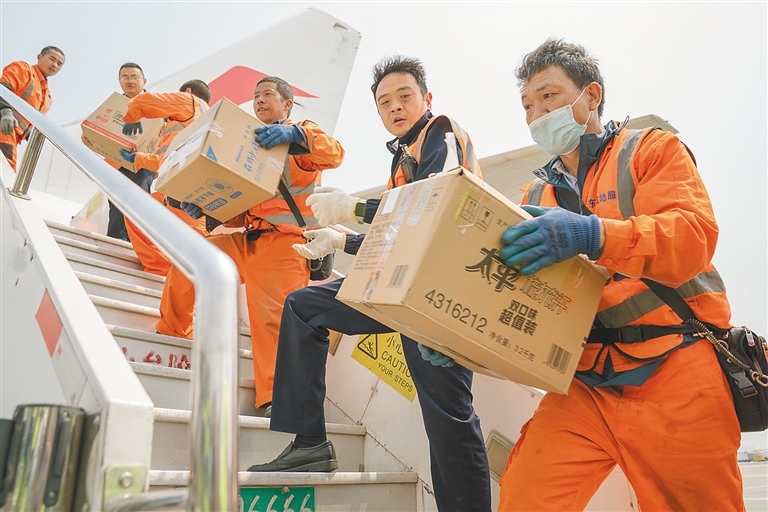 3月30日,在昆明长水国际机场,工作人员往飞机上搬运救援物资。