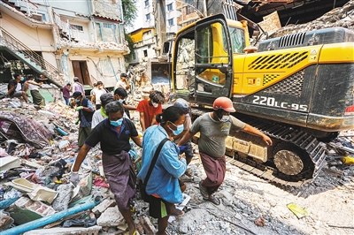 3月30日,在缅甸曼德勒,人们转移地震遇难者遗体。