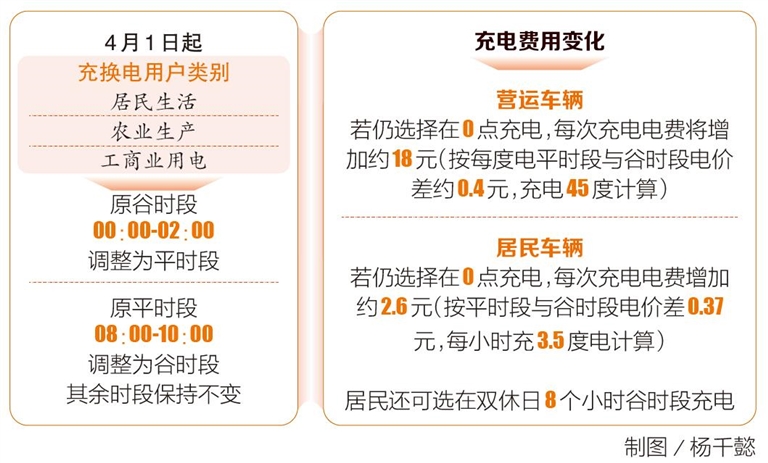 对居民车辆来说,若仍选择在0点充电,每次充电电费增加约2.6元(按平时段与谷时段电价差0.37元,每小时充3.5度电计算),经济上影响不大。预约2点以后充电不会增加经济负担。此外,居民还可选在双休日8个小时谷时段充电。