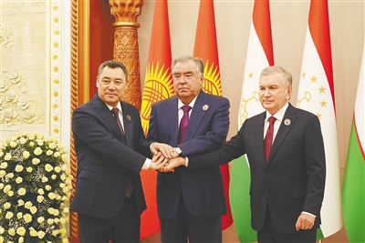 图为在塔吉克斯坦苦盏,塔吉克斯坦总统拉赫蒙(中)、吉尔吉斯斯坦总统扎帕罗夫(左)和乌兹别克斯坦总统米尔济约耶夫举行三边会晤。