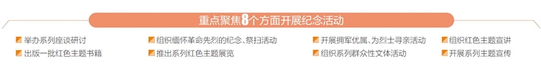 四是组织红色主题宣讲。省委宣传部、各市县都将组织革命文化主题的宣讲。省委省直机关工委将组织开展“致敬自贸港先锋”先进典型事迹宣讲,省国资委将组织开展“勇立潮头 国企担当”先进典型事迹宣讲,以榜样的力量激励大家奋勇担当、争创一流业绩。