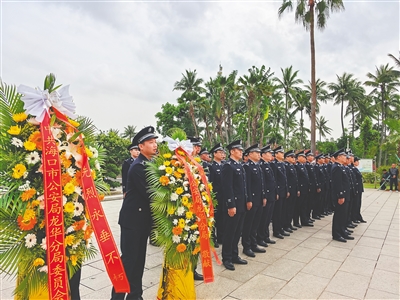 当天上午,海口市公安局龙华分局的60位民警也来到海口人民公园祭奠革命英烈。民警们整齐列队,神情肃穆,集体脱帽默哀,表达对革命先烈的崇高敬意和深切缅怀。随后,两名民警代表手持花篮,迈着缓慢庄重的礼步走向海南革命烈士纪念碑,向革命英烈敬献花篮,表达缅怀之情。