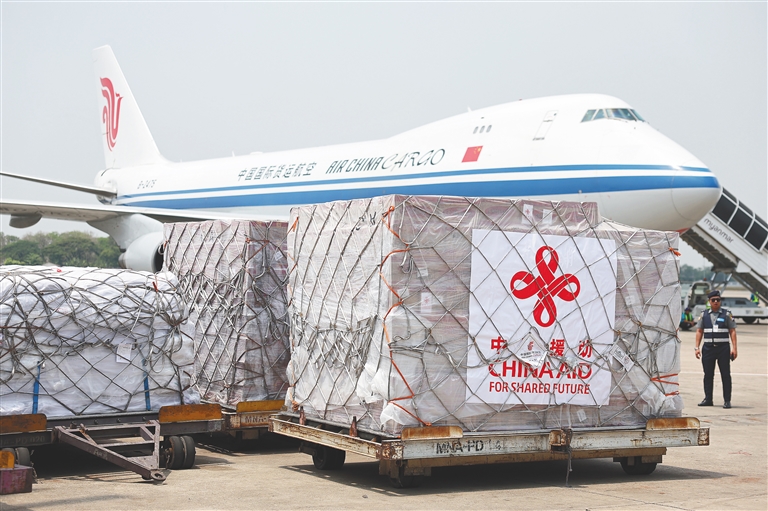 当地时间4月3日,中国政府向缅甸提供的第二批紧急人道主义地震救灾援助物资抵达缅甸仰光国际机场。据缅甸广播电视台3日报道,缅甸强震目前已造成3145人死亡、4589人受伤,另有221人失踪。新华社记者 贾浩成 摄