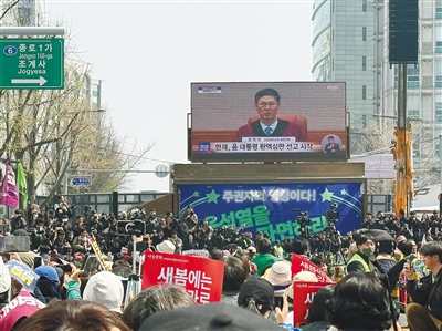 宪法法院宣布裁决结果后,首尔市中心多地聚集的尹锡悦反对者和支持者情绪激动。反对尹锡悦的民众对裁决结果表示欢迎,也有尹锡悦的支持者通过暴力行为宣泄不满。