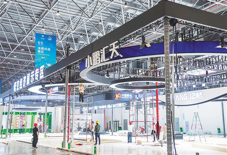 4月7日,位于海口的海南国际会展中心,工人在抓紧搭建第五届中国国际消费品博览会低空经济展示专区展馆。
