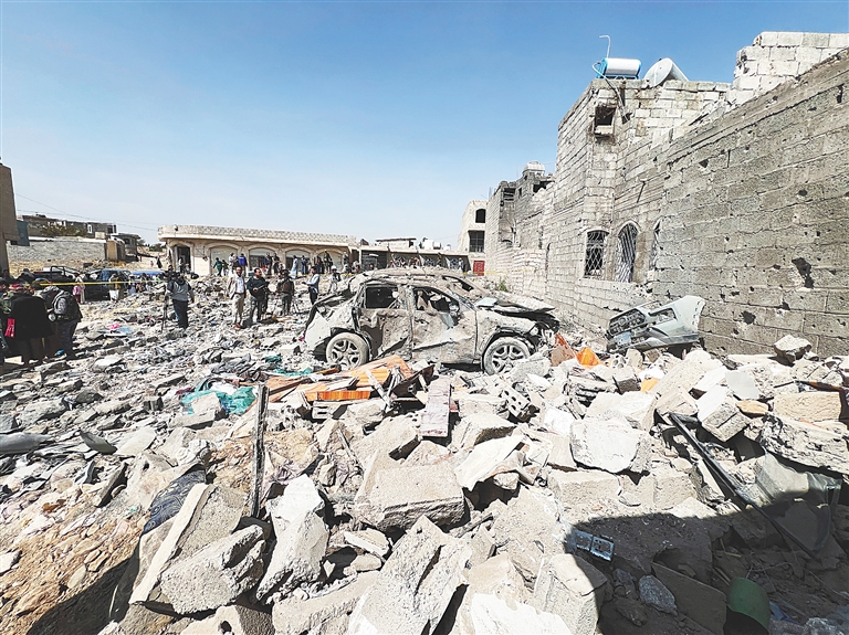 也门胡塞武装卫生部门4月6日发布消息说,美军当晚对也门首都萨那一处目标实施空袭,造成4人死亡、16人受伤。图为4月7日,人们在也门萨那查看美军空袭后的建筑废墟。新华社发