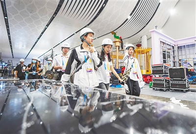 4月8日,在海南国际会展中心5号馆,志愿者在提前熟悉场馆环境。