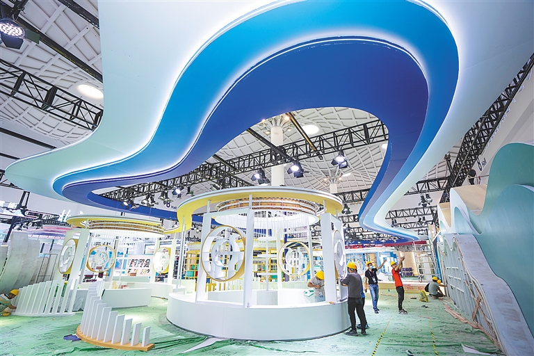 4月8日,海南国际会展中心8号馆内,工人加紧布置海南馆。