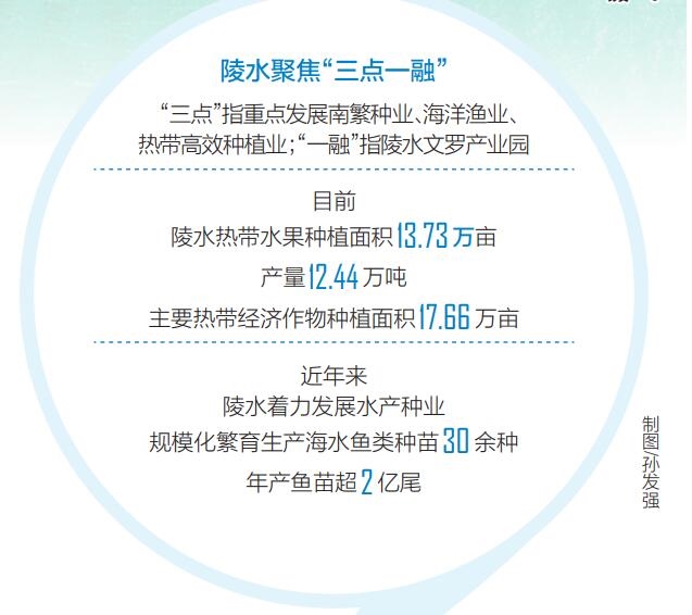 在推进农业产业化过程中,陵水聚焦“三点一融”,其中“三点”指重点发展南繁种业、海洋渔业、热带高效种植业,“一融”指农工旅融合发展,延长产业链,发展加工贸易和旅游业。融合发展的重要载体之一便是陵水文罗产业园。