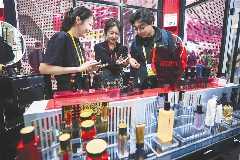 4月13日,第五届中国国际消费品博览会启幕。图为观展嘉宾在法国馆内试用化妆品。海南日报全媒体记者 王程龙 摄