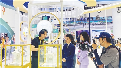“与辉同行”主播董宇辉在消博会展馆了解产品。海南日报全媒体记者 王晓曈 摄