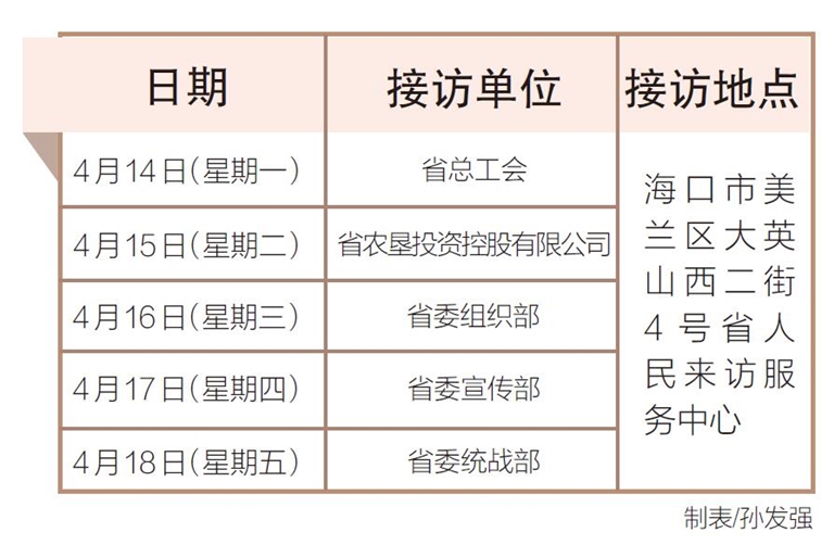 4月14日至18日,省总工会、省农垦投资控股有限公司、省委组织部、省委宣传部、省委统战部相关负责人将在海口市美兰区大英山西二街4号省人民来访服务中心接访群众。