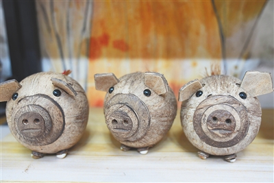 海南椰雕文创种类丰富:日用品系列包括椰碗、椰杯、椰壶、椰勺、椰筷、椰盆等;摆件系列包括“钱袋”“螃蟹”“蟋蟀”等造型。其中,椰雕玩偶的“五官”清晰可见,头发是用椰棕做的,眼睛是用龙眼核嵌入的,呆萌可爱,尤其受到小朋友们欢迎。
