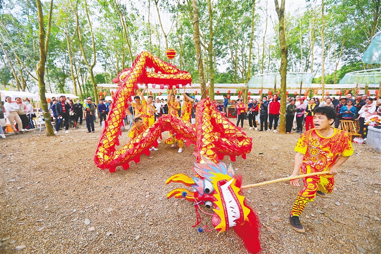 一天,莫基学经过大效村村委会广场,看到村里的舞蹈队正在音乐伴奏下尽情舞蹈。一个想法突然浮上他的心头:这些长期务农的女性都有舞蹈基础,如果能参加龙舞队就好了。“我们舞动的龙头约20斤重。但是,龙珠只有2斤重,整个龙身也只有十多斤重,每次表演时长十几分钟,对于长期务农的女队员来说应该不算难。”莫基学心想。
