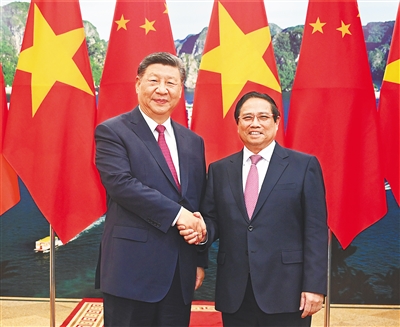 双方要推进高质量发展,为两国携手迈向现代化提供坚实战略支撑。充分发挥中越陆海相连的区位优势,加强发展战略对接,深挖产业合作潜能。稳步推进基础设施建设合作,提升互联互通水平,保障贸易畅通。做大做强贸易、投资等传统领域合作,拓展5G、人工智能、清洁能源、数字经济等新兴产业合作。坚定维护多边贸易体制,共同推动经济全球化朝着更加开放、包容、普惠、均衡的方向发展。