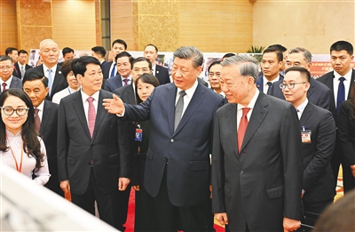 活动前,习近平在苏林、梁强陪同下,观看了中越建交75周年图片展,重温中越双方友好交往的珍贵画面。