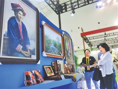 在海南馆另一侧,《家乡的那条小河》《苗族阿婆》《姐妹》等多幅屯昌油画作品同样很受关注。“此次参展,有两个期待,一是促进产业升级,二是推进文旅融合。”屯昌县油画产业协会会长冯丹冰介绍,屯昌是海南的“油画之乡”,自上世纪80年代以来,油画已成为当地特色文化产业,屯昌累计培养了数千名农民画师、画匠,创建于2011年的屯昌油画步行街,已入驻25间画室,拥有50多名驻街画师。今年以来,屯昌油画街持续“上新”,沿街画室的大门、廊道及外墙新添了旧式挂历等一幅幅文创味十足的壁画,吸引了不少游客到此打卡。