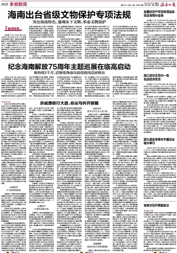 “《条例》突出地方特色,强调水下文物、革命文物保护。”苏启雅说,海南是水下文化遗产大省,水下文物资源丰富。《条例》加大水下文物保护力度,明确水下文物保护区的划定和保护要求,禁止在水下文物保护区内进行危及水下文物安全的捕捞、爆破等活动;明确单位和个人发现疑似水下文物或者水下文物遗址的报告和上交义务;规定对破坏水下文物或者水下文物遗址行为的处理;规定文物行政部门、文物收藏单位推动水下考古科技创新、水下文化遗产研究阐释等义务。同时,《条例》明确政府应当加强对革命文物的保护利用,发挥革命文物在见证革命历史、传承革命精神、弘扬革命文化中的重要作用。