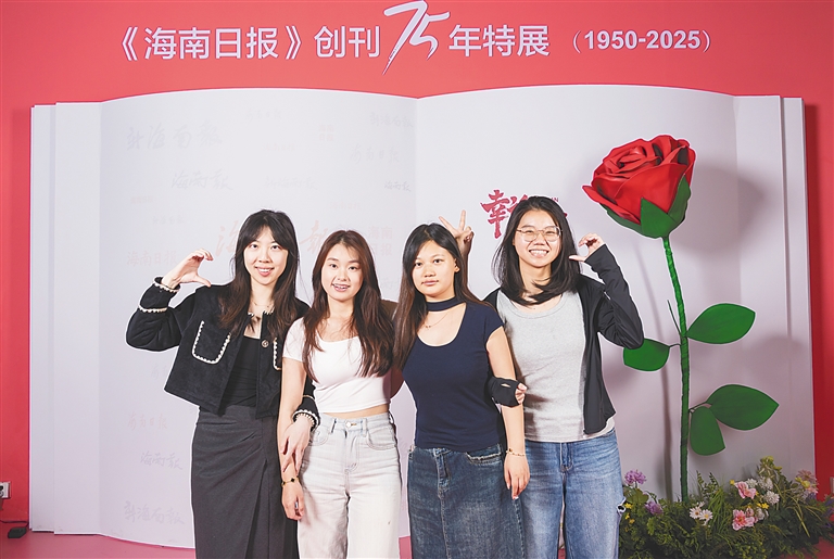 “幸福照相馆”背景墙翻开的“书页”里展示了《海南日报》自创刊以来不同时期的报头。75年来,《海南日报》始终与海南共同成长,在“幸福照相馆”里,每一声对《海南日报》的真挚祝愿都是这段相向而行路途上的“幸福回响”,每一份被快门定格的小确幸都在为那朵象征美好生活的“玫瑰”提供滋养……
