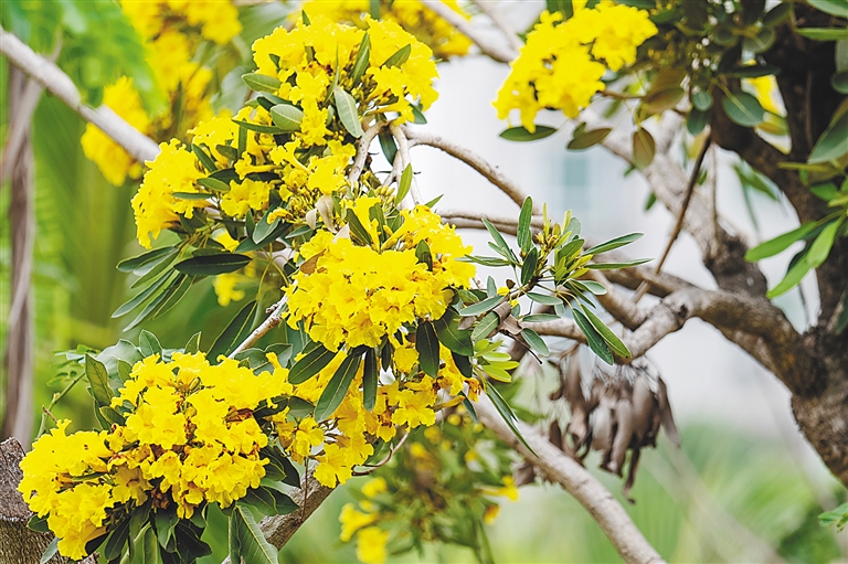 在三亚崖州湾科技城高新区,道路两侧的树木仿佛被阳光镀上一层金箔,满树黄花不见片叶,如风铃般悬垂摇曳。这种原产南美洲的植物,因其花期仅半月而更显珍贵,市民游客纷纷在社交媒体晒出打卡照。