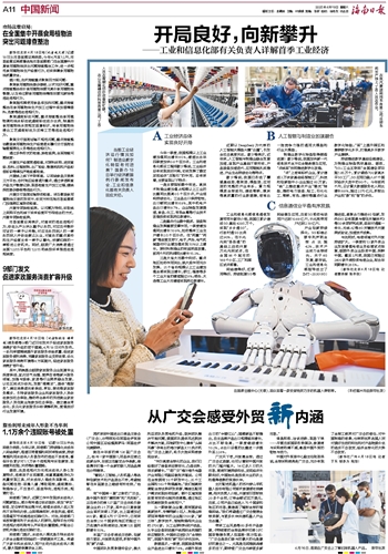一是主要指标稳中有进。高技术制造业增加值占规模以上工业的比重同比提高0.5个百分点,产业结构持续优化。工业品出口保持韧性,出口额同比增长6.9%,其中机电产品出口增长8.7%。企业转型发展提速,食品、化工、有色金属等行业技术改造投资实现两位数增长。