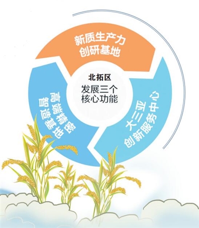 北拓区坚持“研、学、产、城”深度融合,重点发展“新质生产力创研基地、高端精密智造基地、大三亚创新服务中心”3个核心功能,以海洋科技、生物科技和产业配套服务为核心,探索构建“2+X”产业体系。