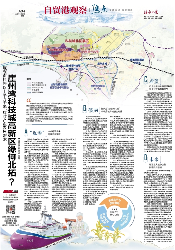 “生态优先、绿色发展是园区既定的长期发展方向。科技城高新区正加快谋划推进北拓展区基础设施项目建设和产业招商,力争以优质项目带动区域高质量绿色发展,进一步夯实海南自贸港科创高地建设基础。”何青松说。(本报三亚4月20日电)