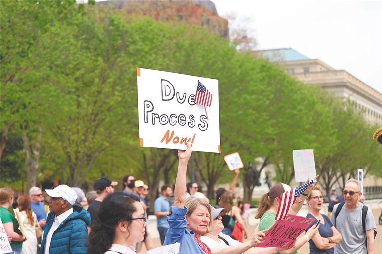 在一家非营利组织工作的弗兰克告诉新华社记者,他来白宫门前抗议,是因为特朗普政府所作所为正在破坏宪法,损害民众利益。他说,美国法律规定,每个人在被证明有罪之前都被认为是无辜的,然而特朗普政府在没有任何审判的情况下,取消学生签证、驱逐移民,把他们赶出美国,其行为违背了正当程序。