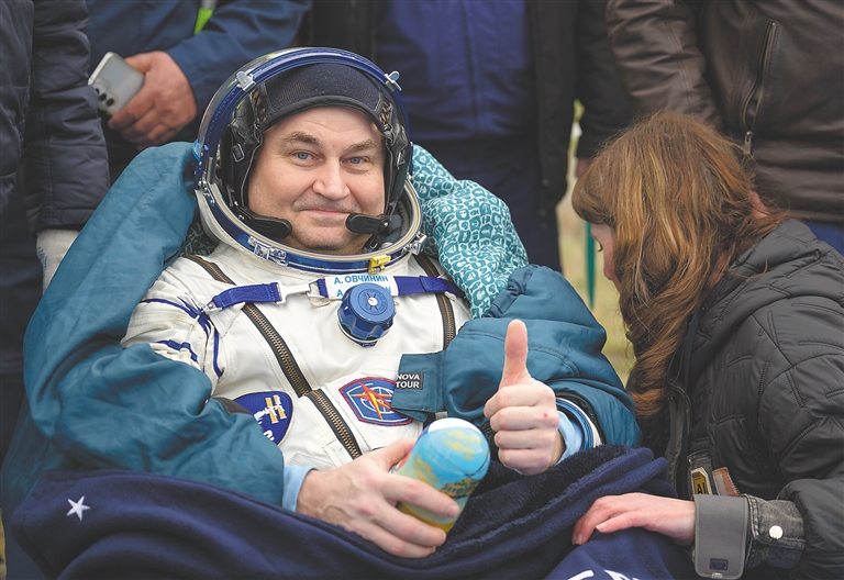 图为4月20日,在哈萨克斯坦城市热兹卡兹甘附近,俄罗斯宇航员阿列克谢·奥夫奇宁出舱。