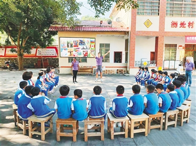 在学校操场的大树下,孩子们围坐一圈,符积虎教他们唱英文歌;雅恩·克里克斯教他们学习站、坐、拍手等不同动作对应的英语单词,设计小游戏让他们跟随英语口令做动作;艾美丽为孩子们上了一堂原汁原味的英语课。从一开始的好奇、陌生到最后的喜爱、不舍,黎乡孩子与志愿服务团老师的心逐渐靠近。
