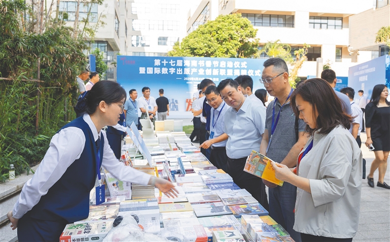 4月23日,第十七届海南书香节启动仪式暨国际数字出版产业创新联盟揭牌仪式在澄迈举行。活动现场,主题丰富的书籍整齐摆放在展台上,与会人员踊跃挑选阅读。