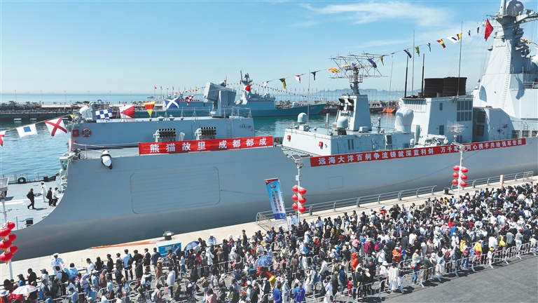 现役舰艇开放是备受民众关注的活动,今年海军开放舰艇超过30艘,型号、数量均超过往年。结合“战舰回家乡”活动,海南舰、秦皇岛舰、潍坊舰、五指山舰、三亚舰等现役舰船靠泊命名省份或城市,南京舰、六安舰靠泊人民海军诞生地江苏泰州,郑和舰靠泊郑和下西洋起锚地江苏太仓,受到当地党政机关和群众热烈欢迎。在山东青岛,成都舰、唐山舰、临沂舰、日照舰、可可西里湖舰等5艘舰船悬挂满旗靠泊开放,几只憨态可掬的大熊猫模型带着“第二故乡”的问候,趴在成都舰舰舷,吸引参观群众打卡拍照。青岛也成为开放战舰次数最多、单次开放战舰数量最多的城市。在黄浦江畔,沂蒙山舰、西安舰靠泊上海港国际客运中心码头,与地标建筑东方明珠广播电视塔同框出镜。