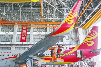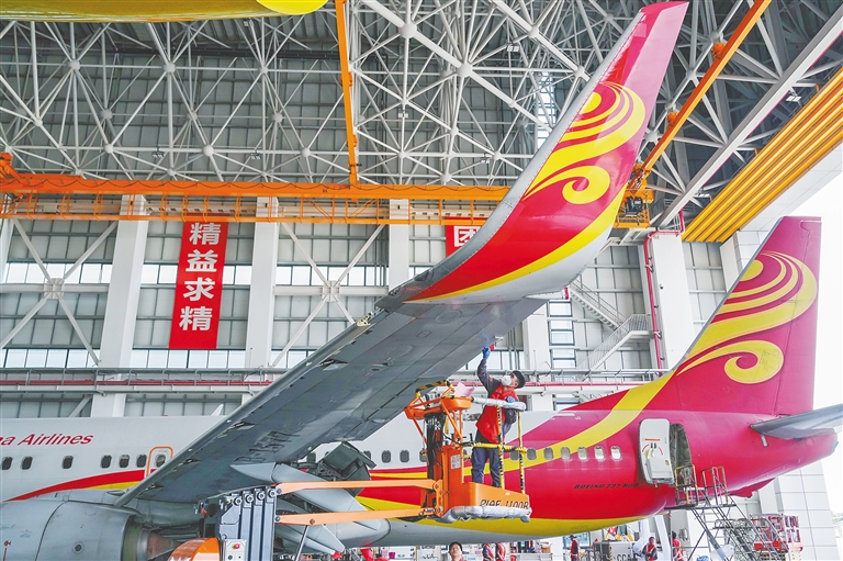 近日,在位于海口空港综保区的海南自贸港一站式飞机维修产业基地,工作人员正在检修飞机。在海南自贸港“零关税、低税率”政策加持下,该基地正成为全球航空公司的“保养中心”。
