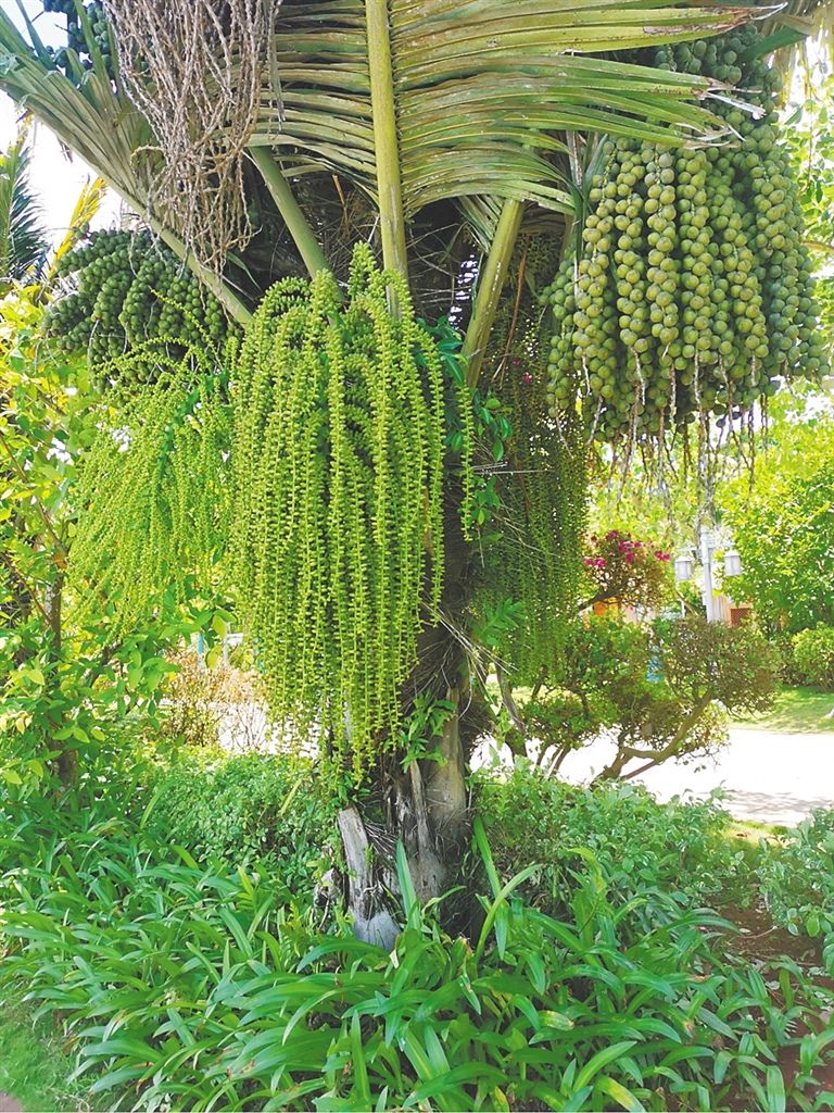 明代时任儋州同知的顾玠在海南待了六年,其间见识了这种神奇的植物,他在著作《海槎余录》中如此写道:“桄榔木身直如杉,又如棕榈、椰子、槟榔、波斯枣、古散诸树而稍异,有节似大竹。树杪挺出数枝,开花成穗,绿色。结子如青珠,每条不下百颗,一树近百余条,团团悬挂若伞,极可爱。”桄榔树开花成穗,结出的青果圆溜溜,一束束、一串串,几百上千颗,甚为可爱。