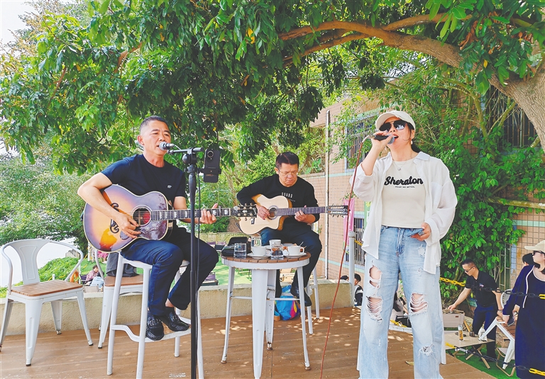 “在我的怀里/在你的眼里/那里春风沉醉/那里绿草如茵……”最近一个周日的下午,定安县南丽湖片区湖畔咖啡院中,传来一阵悠扬的歌声。