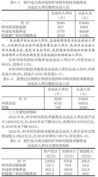2023年,科学研究和技术服务业企业法人单位全年实现营业收入295.9亿元,比2018年增长128.7%(详见表5-3)。