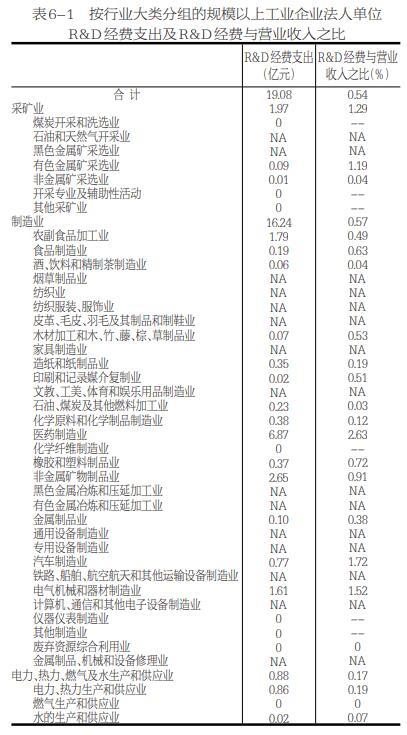 2023年,规模以上工业企业法人单位R&D经费支出19.1亿元,比2018年增长67.8%;R&D经费与营业收入之比为0.5%。规模以上工业企业法人单位分行业R&D经费支出及R&D经费与营业收入之比详见表6-1。
