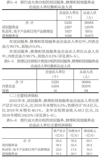 2023年末,居民服务、修理和其他服务业企业法人单位资产总计92.2亿元,比2018年末增长5.2%;负债合计76.4亿元,比2018年末增长46.1%。全年实现营业收入68.1亿元,比2018年增长242.8%(详见表5-6)。