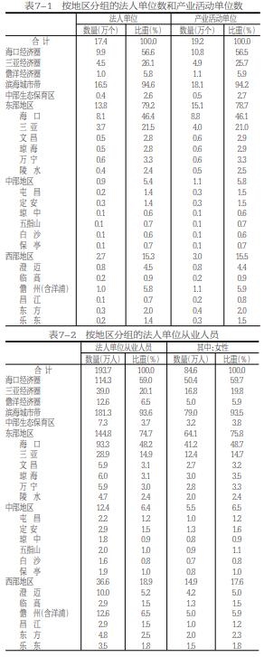 在第二产业和第三产业法人单位中,位居前三位的地区是:海口市8.1万个,占46.4%;三亚市3.7万个,占21.5%;儋州市(含洋浦)1.0万个,占5.8%。